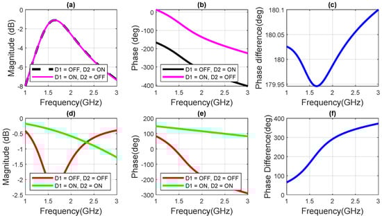 The reflection magnitudes and phases are plotted in Figure 4d and Figure 4e, respectively, for two different switching state combinations; (1) when (D1 = OFF, D2 = OFF) and (2) when (D1 = ON and D2 = ON). The reflection magnitude is higher than dB for both switching state combinations from 1 GHz to 3 GHz, whereas the difference between the reflection phases increases gradually with frequency increasing from 1 GHz to 3 GHz. However, if we consider a phase range of , we can still obtain a narrow band operation from GHz to GHz, as is shown in Figure 4f. Such variations in phase are acceptable to modulate the reflecting field from the RIS [24].