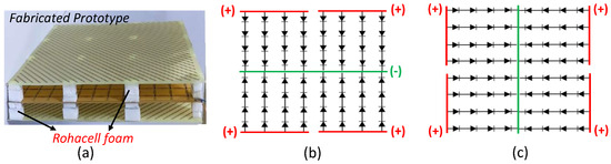 A basic prototype was fabricated using an array of 12 × 12 unit elements, as depicted in Figure 7a, to empirically verify the scattering properties of the suggested unit element. The substrate layers were assembled using pillars of Rohacell foam, which was employed to accommodate the air gap within the unit cell. The electrical characteristics of Rohacell foam closely resemble those of air, featuring a permittivity of 1.050 and an exceptionally low loss tangent of less than 0.00002. The p-i-n diode is soldered within the space between the two metal strips present in the middle substrate layer, on both faces. The schematic illustrating the biasing arrangement for the p-i-n diodes on the upper and lower surfaces of the middle substrate board is shown in Figure 7b,c.