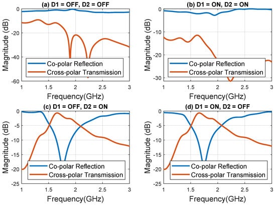 Measured magnitude for cross-polar transmission and co-polar reflection coefficients of the fabricated prototype for different states of the p-i-n diodes (a) 00 state, (b) 11 state, (c) 01 state, and (d) 10 state.