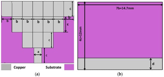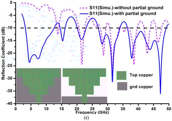 The size of the single-element antenna is 14.7 mm × 12 mm × 1.6 mm. In this design, the following design variables are considered, which are “a”, “b”, “c” and “d”. For optimized performance of the antenna, the design variables a, b, c, and d are considered as 1.5 mm, 2.1 mm, 3 mm, and 2.3 mm, respectively. The top and bottom views of the proposed antenna element are shown in Figure 1a and Figure 1b, respectively. The simulated reflection coefficient is depicted in Figure 1c, where the antenna structure with a partial ground plane provides an excellent result in comparison to a structure with a full ground plane.