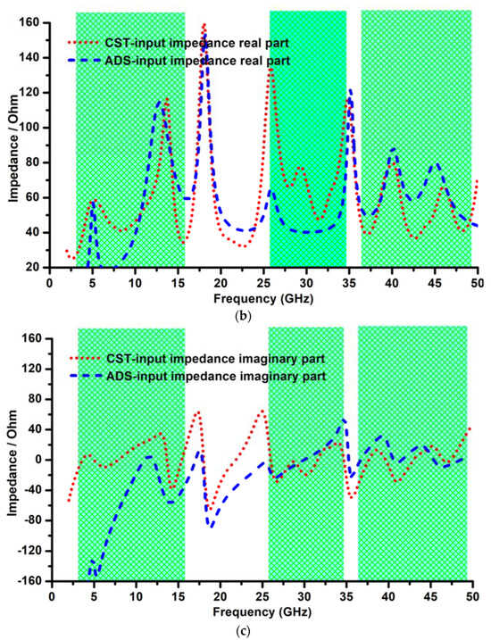 The real (resistive part) and imaginary (reactance part) parts of the input impedance of the proposed MIMO antenna system are depicted in Figure 2. Figure 2b represents the real part of input impedance, obtained from CST and ADS simulation, whereas Figure 2c represents the imaginary part. Here, the proposed antenna shows good matching with the coaxial cable within all operating frequency bands.