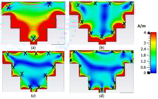 The interfacial current distributions at a frequency of 11.1 GHz, 31.6 GHz, 37.8 GHz, and 46.7 GHz are illustrated in Figure 3a, Figure 3b, Figure 3c and Figure 3d respectively. In all cases, the minimum surface currents are observed over the edges of the patch with a null point (cross-marked i.e., ‘X’). In Figure 3a–d the null points near the perimeter of the patch are found as 3, 9, 11, and 14, respectively. In order to find the resonance frequency, the number of null points plays a vital role.