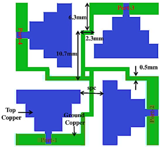The proposed quad-element MIMO antenna system is illustrated in Figure 4. The size of MIMO is 31.7 mm × 31.7 mm. In this MIMO system, the port direction of any one of the antenna is kept perpendicular to every other port direction, and the placement of antenna elements is also symmetrical to one another. Both the properties’ symmetrical arrangement of elements and the orthogonality of ports lead to providing low ECC and better port isolation. Additionally, to achieve the common ground plane of the proposed MIMO system, four satire-step microstrip lines originating from each end of the rectangular microstrip line, which is present just beneath the ports in the ground plane, are connected to one common square strip. The creation of a common ground plane in this article is responsible for improving capacitance and inductance, leading to improved efficiency and gain of the MIMO antenna system. The design variable “spc” indicates the distance between two adjacent patches. In this article, “spc” is considered as 5 mm for the minimum isolation of 15 dB in the OFB1 band.