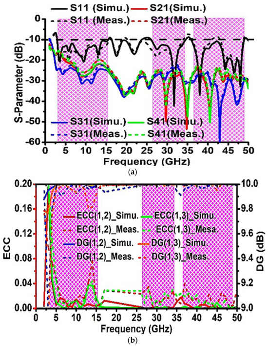 The MIMO performance of the proposed antenna system is investigated in terms of S-parameter, ECC, DG, radiation pattern, efficiency, gain, MEG, TARC, CCL, and CC. The measured −10 dB impedance bandwidth of the proposed MIMO antenna system are 3–15.5 GHz (% bandwidth of 116.27), 26.4–34.3 GHz (% bandwidth of 32.45), and 36.1–48.9 GHz (% bandwidth of 32.74). Over the entire frequency bands in OFB1, OFB2, and OFB3 the simulated minimum values of port isolation are 15.7 dB, 23.2 dB, and 23.2 dB, respectively; however, the measured minimum values of port isolation are 15 dB, 22 dB, and 22.3 dB, respectively. The simulated and measured S-parameter is depicted in Figure 6a. The envelope correlation coefficient () can be used for assessing the diversity efficiency of the MIMO antenna system.