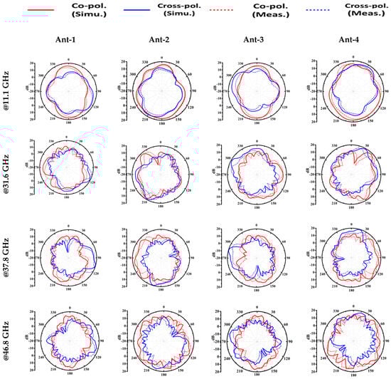 Figure 7 depicts the simulated and measured two-dimensional (2-D) radiation patterns of Ant1-Ant4 at the frequencies 11.1 GHz, 31.6 GHz, 37.8 GHz, and 46.8 GHz in the XZ plane.
