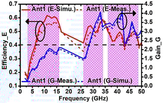 Based on the observations, it is discovered that the radiation patterns of (Ant1, Ant3) and (Ant2, Ant4) are complementary to each other in the XZ plane. Such complementary radiation pattern qualities enable a low value of ECC between antennas and are also useful in producing self-isolated MIMO antenna systems. In Figure 8, the total efficiency and gain of Ant1 is illustrated. The simulated average efficiency and gain of Ant1 over the frequency bands OFB1, OFB2, and OFB3 are (49.1%, 1.76 dB), (58.2%, 4.65 dB), and (50.5%, 5.07 dB), respectively, whereas the measured average efficiency and gain over the frequency bands OFB1, OFB2, and OFB3 are (44.3%, 1.54 dB), (48.1%, 4.42 dB), and (44.9%, 4.85 dB), respectively.