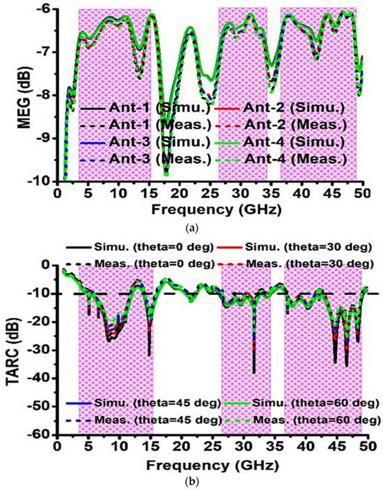 The value of TARC is calculated with the assumption of . For a better performance in investigated bands, the TARC should be from 0 to 1 and the ideal value of TARC should be less than −10 dB. In this article, the simulated and measured TARC at over the frequency ranges OFB1, OFB2, and OFB3 are below or about −10 dB except for the frequency band 12–14 GHz (in this band average, TARC is −6.9 dB). The simulated and measured TARC values are illustrated in Figure 9b.
