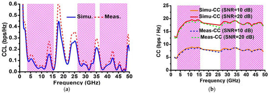 An additional fundamental diversity attribute measure that may be used to assess MIMO performance is CCL, which shows the greatest rate at which data can be delivered without experiencing significant losses. Equation (9) [49,50] can be utilized to calculate CCL. The CCL ought to be below 0.4 bps/Hz throughout the operating frequency spectrum for the best MIMO antenna. Here, the greatest CCL (simulated and measured) value over the frequency ranges OFB1, OFB2, and OFB3 is less than 0.3 bps/Hz, indicating a strong candidate for use on the desired band. Figure 10a shows a CCL versus frequency plot.