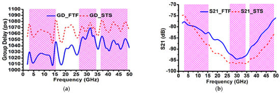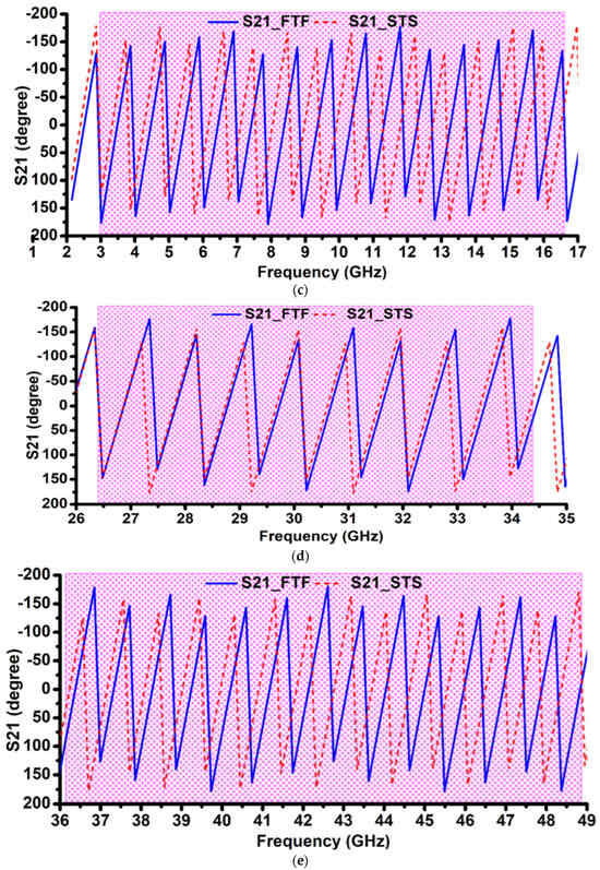 Figure 12 shows the group delay (GD), magnitude of the S21, and phase of S21. From Figure 12a,b, it is clear that the group delay lies between 1010 and 1085 ps; however, the S21 dB was below −75 dB over bandwidths OFB1, OFB2, and OFB3. The S21 phase is shown in Figure 12c–e, showing the linear features within all the desired wideband operations in both FTF and STS layouts.