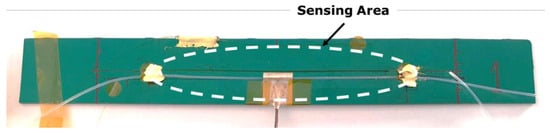 The test specimens were PCB with 200 × 25 mm × 1.6 mm dimensions, as shown in Figure 1. A single OF was used with a segment bonded to the PCB and another freely inserted in the PTFE sleeve. Calibrated thermocouples were used for temperature reference. A K-type thermocouple (RS Components, Northants, UK) was mounted on the sample, directly over the PCB substrate, and fixed with standard aluminum tape (KIC, San Diego, CA, USA) with a thickness of 0.15 mm to ensure thermal homogeneity.
