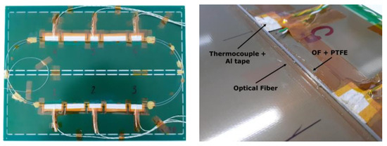 Instrumented PCB with 6 thermocouples and a single OF with segments bonded to the PCB and inside a bonded PTFE sleeve. The numbers are the references of the six strain gauges used at different positions, three in each side of the OF segments.