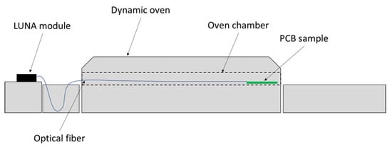 The OF was connected to the high-definition optical fiber detection system (HD-FOS) ODiSI-B from LUNAinc® equipped with a class 1 laser and one acquisition channel. This OF interrogator adopts an OFDR technique. The distributed sensing approach allowed measuring temperature and strain at each 2.6 mm over the OF length, with a frequency of 100 Hz and at an acquisition rate of 1 Hz. The OF interrogator was placed outside a dynamic oven, as shown in Figure 3. The OF measures the temperature and strain while the PCB sample progresses on a conveyor inside the oven chamber (left to right).