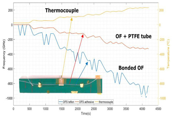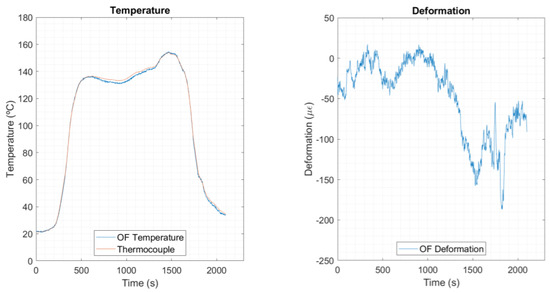 Figure 4 shows the simultaneous measurements of the temperature and strain from the OF under the three-point bending test. As one can observe, the OF dedicated to temperature measurements does not respond to the deformations induced on the sample. In fact, its evolution is alike the thermocouple response. It can, therefore, be assumed that the entire output of this sensor is only due to the temperature variations in the sample.