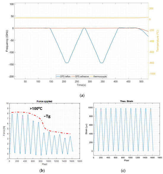 The OF sensor response to temperature can be obtained when calibrating these results with the reference thermocouple data. This includes the response of the OF to the thermomechanical deformation, and its expansion with temperature, among other effects of the OF and of the used adhesive. On the other hand, by considering the portion of the signal under induced strain (at a constant temperature), the sensor response only under strain can be obtained. In this way, temperature and strain calibrations can be performed separately, as shown in the next section.