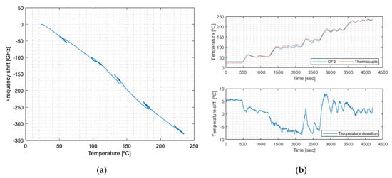 Temperature calibration relates the strain-free sensor’s output to the reference thermocouple data (solid and dotted lines in Figure 4), as presented in Figure 6a. Figure 6b shows the temperature deviations from the reference thermocouple measurements.