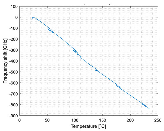 The output of the OF bonded to the PCB substrate shows two distinct behaviors: (i) the frequency variations in the optical signal as a function of the temperature, following the shape of the curves of the PTFE + OF sensor and of the thermocouple, and (ii) the frequency variations in the optical signal at each temperature level, i.e., the response to the mechanically induced deformations. It appears that the sensor response to pure strain is approximately constant at each temperature increment (2 mm bending ≈ −150 GHz). However, the force required to apply the 2 mm deflection decreases with the increment of the temperature, displaying a step down from 100 °C, and a stabilization from 150 °C onward. This decrease in the force is, most likely, due to an increased flexibility of the substrate material (FR4) after exceeding its glass transition temperature Tg (the Tg of FR4 is c.a. 135 °C). Figure 5 presents this data interpretation and summarizes the sensor response to the induced mechanical deformation at each temperature level.