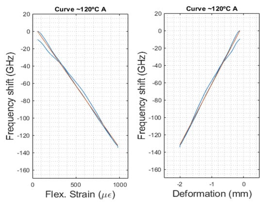In the calibration of the mechanically induced deformation, only the OFS signals during the stable temperature levels (∆T ≈ 0 °C) were analyzed. To determine the influence of the OFS signal under deformation alone, only the portions of the lower line curve of Figure 4, with purely mechanical deformation (triangular shaped responses), were considered and related to the data acquired by using the mechanical test machine. As an example, the calibration curves for a constant temperature of 120 °C are shown in Figure 8.