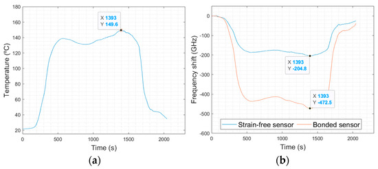 The three abovementioned models were compared for a better understanding of their accuracies and drawbacks, taking as an example the temperature profile used in the trials in a dynamic oven, in an industrial environment. Figure 9 shows the temperature profile and OFS measurements. Picking up the assigned maximum temperature point (t = 1393 s; T = 149.6 °C), the temperature and deformation from the signal acquired at the OFS can be calculated using the three abovementioned methods. The following values for the frequency of the strain-free sensor, vsf = −204.8 GHz, and for the bonded sensor, vsb = −472.5 GHz, were considered. Note that these values mean that the frequency shift of a bonded OF is much higher than a strain-free OF, as would be expected due to the superposition of strain and temperature effects in the former. Furthermore, both effects appear to have similar influences, as vsb/vsf = 2.3. Also, the following values of kT = −0.645 °C·GHz−1 for temperature sensitivity and kε= −6.05 με·GHz−1 for strain sensitivity were used in the first two models. The thermo-optical coefficient of the OF is 0.95 and the CTE of the PCB substrate (in X/Y directions) is in the range of 15.3 to 17.7 ppm/°C (determined in a thermomechanical analysis experiment).