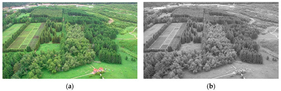 It is known that the structure and texture characteristics of visible images usually will not vary with optical bands. For the sake of processing speeds, grayscale images are used as the basis of image registration in this work, and input RGB images are grayed according to the importance of three optical bands. The intensity of each pixel is generated from a weighted average of three different components. A graying instance of UAV images is given in Figure 2. Considering the sensitivity of human eyes to color information, the intensity of an arbitrary pixel can be denoted as