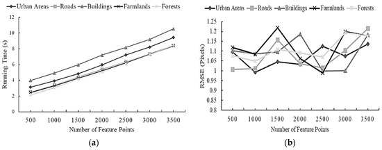 Since the number of feature points extracted by the ORB operator is optional, a comparative experiment is carried out to determine an appropriate number of feature points for optimal registration effects. Hence, the UAV images of five scenes are registered through the different numbers of feature points extracted by the original ORB algorithm. The relationship between the number of feature points and running time or Root Mean Square Error (RMSE) are separately plotted in Figure 4a,b. RMSE can be denoted as follows [2].
