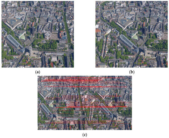 A UAV image pair from an urban scene and the feature points after the initial screening: (a) the image to be registered; (b) the reference image; (c) the image pair after the rough screening. The corresponding points are connected by red lines.