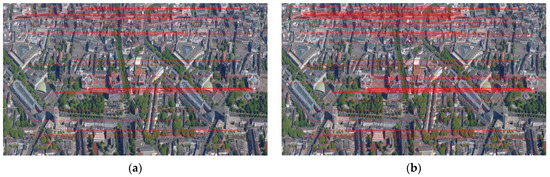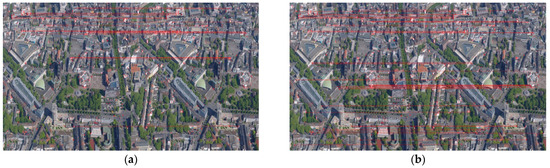 The urban image pairs after bi-directional matching according to two strategies: (a) Strategy 1; (b) Strategy 2. The corresponding points are connected by red lines.