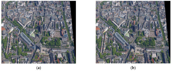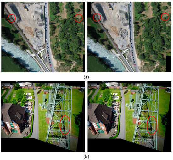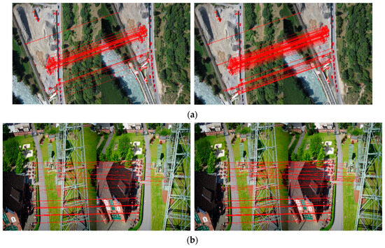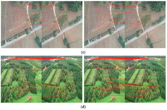 The sources and parameters of UAV images used in the registration experiments are listed in Table 1. The urban and building scene images are, respectively, selected from the high-altitude and near-ground drone data of an ISPRS benchmark for multi-platform photogrammetry [41]. The image pairs of a road scene are the test images provided by Pix4Dmapper v.2.0 software. The farmland and forest scene images are self-collected. Particularly, the image pair of a farmland scene was acquired by the Parrot Sequoia multispectral camera with four bands, including green, red, red-edge, and near-infrared. Its red edge images are employed as blue components in the registration of this work. The two images of each scene image-pair were taken at different angles with an overlap. The image pair of the urban scene possesses many details and is quite complex, as shown in Figure 5. As mentioned before, 1000 pairs of feature points are extracted in the two images, and only 99 pairs of points are left after initial screening, as displayed in Figure 5c.