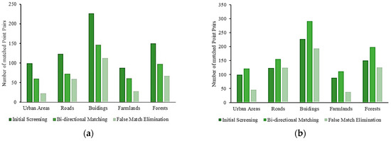 In addition, the numbers of matched point pairs in the five scene images after different process stages are illustrated in Figure 9. It is known that there are abundant detail features in the UAV images of urban areas, buildings, and roads. In contrast, the contents of the UAV images of farmlands and forests are relatively simple, and their feature textures are not enough. In general, a sufficient number of feature points need to be extracted by matching methods effectively for fitting transformation model parameters. For the scene images of urban areas, buildings, and roads, a relatively large number of representative feature points can be detected. Although it benefits the increases in registration accuracies, it also spends more time in additional calculations. For the images of farmlands and forests, fewer and lower representative feature points are detected, which leads to lower registration accuracies but less calculation time.