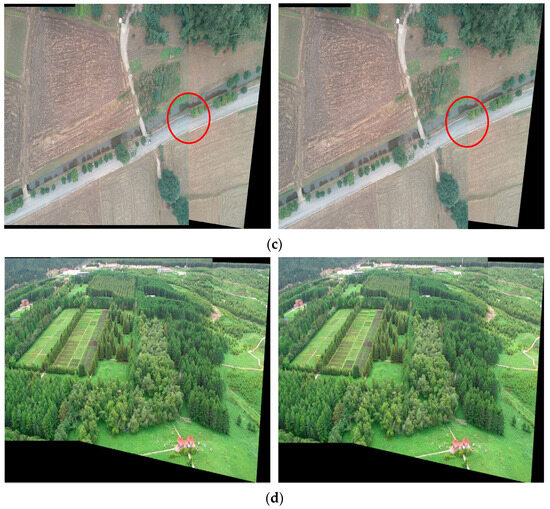The results of bi-directional matching for the other four scene image pairs are in Figure 10, and the final stitched images are displayed in Figure 11. It can be observed from Figure 11a that in the road scene, there are slight mismatches for one road in the mosaicking result of the first bi-directional matching strategy. The reason may be that the less matched point is extracted by this strategy. In Figure 11b, there are some obvious boundary effects in the body of a transmission tower, which may be due to its incomplete appearance at the edge of the reference image. From Figure 11c,d, it can be thought that though there are no significant edge features such as points and lines in the scenes of farmland and forest, the proposed fast registration provides good results for these image pairs. It can be noted that only a visible mismatch for one road exists in the result of the first bi-directional matching strategy for the farmland scene. This may be owing to its insufficient matched point pairs, as shown in Figure 10c. However, some areas for road and farmland scenes appear blurred owing to the quality of input images. Specifically, the red edge images of the farmland scene regarded as blue components in registration are inherently not clear enough. In addition, imaging conditions, such as shooting heights, sensor characteristics, atmospheric visibility and wind speed, light intensity, and the stability of drone platforms, may all affect the quality of drone images.