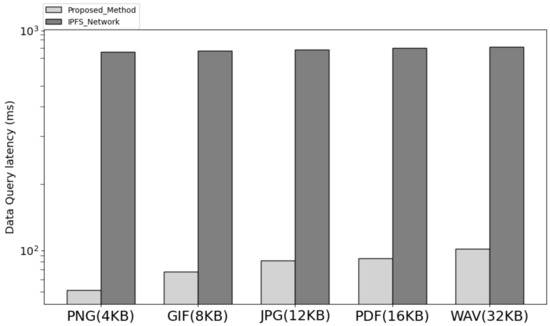 Figure 6 is the result of comparing the data input time of the network implementing the proposed system architecture and IPFS. In the proposed architecture, the user sends a request including the file binary and account information to the service leader node, and the service leader node broadcasts the request to the cluster node. The cluster node delivers the requested metadata to the service leader node, and the leader node combines them and transmits them to the smart contract. In the smart contract, the synchronization transaction is stored through the data transmitted by the service leader node, and the data of all cluster nodes is confirmed to be synchronized. In the process, when the latency from the time the user transmits the request to the synchronization transaction request to the smart contract was measured, the latency was lower than when the data of the same size were stored in the IPFS.