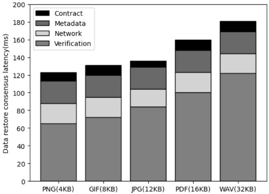 Figure 8 is the result of measuring the latency for data consensus in progress to ensure synchronization of all cluster nodes for data when saving data in the proposed system architecture. To store the synchronization transaction, the file binary data are passed, and the cluster node must store the binary data and generate metadata, including the file hash and signature. In addition, the service leader node sends a request to store the synchronization transaction in the smart contract through the corresponding metadata. This process is included in the process of data consensus by storing the synchronization transaction. As a result of measuring this process, there was no significant difference according to the data size, and there was no large latency in the smart contract call or metadata generation latency. In the case of network latency, it increased as the data size increased, but it was confirmed that the increase did not significantly affect the performance.