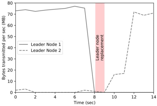 Figure 10 shows the result of a comparison with the architecture in which the proposed leader replacement policy is applied to solve the traffic increase problem of the centralized gateway of the existing distributed file system. For the experiment, the user’s request was transmitted at the same interval when the leader node replacement method was applied and when it was not applied. In the case of leader node replacement, the three leader nodes change their order every 0.9 s in a round-robin manner and receive user requests. As a result of the experiment, when the gateway was centralized, the overall traffic increase was high for both data delivery and transmission from the leader node. When the user’s request data are transmitted, network traffic is about three times higher when there is one leader node than when three nodes are changed in a round-robin method. When user data are transmitted to the cluster node, the amount of traffic generated is higher than that of input traffic, and it is twice as high as when round-robin is applied.