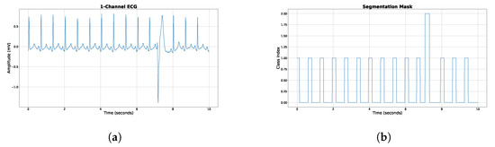 The ECG signals were divided into discrete 30 s segments, without any overlap, and a corresponding segmentation mask was developed for each of these sections as previously described (see Figure 2). If the ECG signals were less than 30 s in length, they were zero-padded to reach the desired 30 s duration. We made the decision not to normalize the amplitude of the ECG signals, opting instead to apply certain preprocessing steps. These included the utilization of a high-pass forward–backward Butterworth filter with a set cutoff frequency of 0.5 Hz, as well as a power line filter. To further refine the signals, all were downsampled to a frequency of 125 Hz using linear interpolation. These preprocessing steps were executed on the entirety of the signal prior to division into the aforementioned 30 s segments. This procedural routine was consistently applied across all the datasets. The samples we selected only contained either a normal or a premature ventricular contraction (PVC) beat. We consciously omitted windows that contained beats that could not be accurately classified during dataset labeling. Figure 3 displays a representative 10 s ECG sample paired with its corresponding segmentation mask for illustrative purposes. The construction of the segmentation mask is delineated below. For each regular beat across our datasets, a label of class index 1 is assigned 100 ms preceding and following the R-peak. For PVCs, a label of class index 2 is given 100 ms before the R peak and extended to 150 ms post R peak to encompass the entire characteristic of a PVC beat. Any other region is labeled with a 0, denoting the background (see Figure 3b). The compilation of the training set resulted in approximately 4 million 30 s windows. To tackle the prevalent class imbalance often seen in medical datasets, we opted for an oversampling approach tailored to the PVC class during training. While the focal loss function was used to mitigate class imbalance effects, it doesn’t fully prevent potential biases towards the dominant class. Therefore, to foster unbiased learning and bolster our model’s PVC detection efficiency, we aimed to achieve an equitable distribution of both PVC and regular heartbeat classes in our training set.