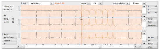 Screenshot from the custo diagnostic software. The model is enabled to predict normal beats (black) and ventricular tachycardia (beats labeled as V—orange).