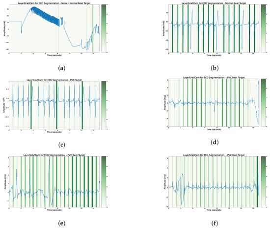 Examples from our custom medical test dataset utilizing LayerGradCAM attributions from the concluding decoder convolutional layer. A more pronounced attribution in a specific class is represented by a deeper shade of green. The R peak frequently emerges as the most salient feature. (a) The model’s sensitivity to patterns that mirror conventional QRS regions. (d) Surrounding beats influence the model’s decision regarding the PVC beat. (e,f) The model’s methodology of assessing the full segment prior to determining the PVC beat. Notably, these decisions are incorrect. (a) Activations for the normal beat class under noisy conditions (false positive). (b) Activations for the normal beat class. (c) Activations for the PVC beat class. (d) The PVC beat is not directly considered for the final decision. (e) Activations for the PVC beat class (false positive around 7 seconds). (f) Activations for the PVC beat class (false positive at the end of the segment).