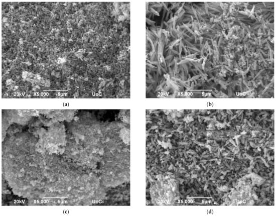 The surface morphology of the heterostructure was investigated via scanning electron microscopy, the images of which are presented in Figure 3a–f. From these, the two different materials, NiO and SnO2, can be distinguished, indicating the formation of the heterostructure. The morphology of the heterostructure prepared with pH = 6 and annealed at 300 °C as well as of those prepared with pH = 8 and annealed at 300 °C and 600 °C consist mainly of rods (SnO2) with different sizes depending on both the pH and annealing temperature, accompanied with nanosized cubes of NiO. This is in agreement with the stoichiometric analysis presented in Table 2, in which the ratio NiO/SnO2 for the above-mentioned heterostructures is almost equal to 35%/65%, thus containing the least amount of NiO. In the other heterostructures, a sponge-like morphology can be observed; however, the two materials can be distinguished, even in the heterostructure in which the ratio NiO/SnO2 is almost 44%/56%, which is the highest NiO content.