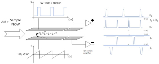 The DMS spectrometer’s principle of operation is shown in Figure 1. The DMS spectrometer is constructed of two parallel plates on which metal electrodes are placed [23,24,25,26]. The electric field is perpendicular to the direction of gas flow. In the spectrometer, there is an area for the ionization of the sample and an area where the ions are separated. Under the influence of the electric field generated in the detector volume, ions are segregated on the collection electrode. The observed segregation of ions present in the flowing gas is due to their different mobility in fields of lower and higher intensity.