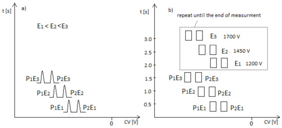 In the case of the DMS spectrometer used for explosives detection, three SVs are applied to a stationary device, and each voltage is recorded for 0.5 s. The method of recording the spectra is shown in Figure 2.