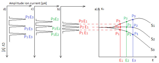 Figure 3a shows the changes in ion mobility for three different substances, S1, S2, and S3, and three different electric fields, E1, E2, and E3. Figure 3b–d shows the spectra’s for the DMS spectrometer when, for high voltage SV separation, the field strengths are E1, E2, and E3, respectively. It can be seen that the spectra differ mainly in the position of the peaks. For the highest field, the peak spacing is the largest.