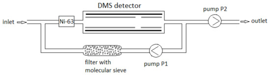 The DMS2 detector’s gas system (without a semi-permeable membrane) was devoid of a P3 pump. Thus, the air circulation was as follows: from the inlet, the air passed into the DMS chamber together with the carrier gas produced during air recirculation through the molecular sieve filter (pump P1); next, pump P2 caused air to flow into the detection system and be blown out after analysis.