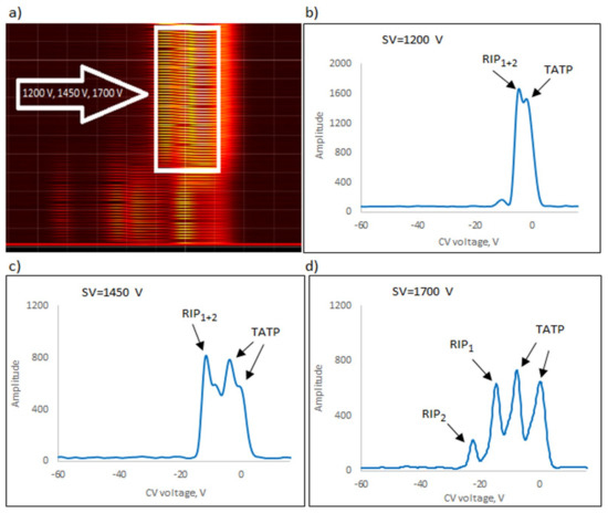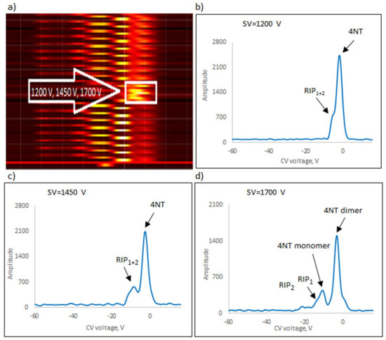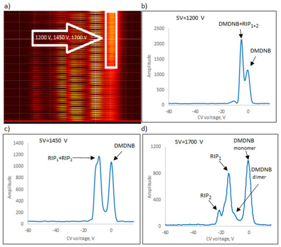 The following explosives/explosive taggants were tested using a stationary explosive trace detection system (a gate): NM, TATP, HMTD, DMDNB, and 4NT. Registration of dispersion plots was carried out in “multi” mode (cyclic data were read for strictly defined separation voltages (SVs)). Figure 9b–d, Figure 10b–d, Figure 11b–d, Figure 12b–d and Figure 13b–d respectively show the spectra extracted for specific SV values, which were characteristic of specific substances. In our case, these were three SVs: 1200 V, 1450 V, and 1700 V (Figure 9a, Figure 10a, Figure 11a, Figure 12a and Figure 13a respectively). One scan for these three SVs took approximately 1 s.