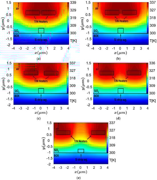 Figure 2a–d shows the thermal profile of the TOPS with different distance between the two TiN heaters. The high peek temperature of the TiN heaters (339–336 K) can be noticed in Figure 2a–d, and the heaters location was set above 1.1 μm in order to avoid the possibility of light coupling from the Si wg to the heaters, which is a key feature to obtain the very low attenuation coefficient.