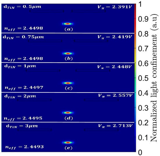 Solution of the fundamental TE mode at 1550 nm wavelength inside the Si strip: (a) dTiN = 0.5 μm, (b) dTiN = 0.75 μm, (c) dTiN = 1 μm, (d) dTiN = 2 μm, (e) dTiN = 3 μm.