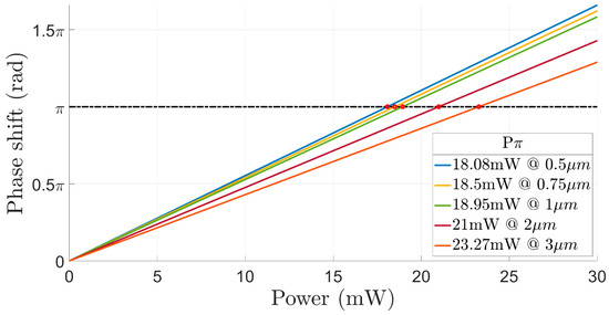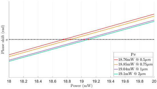 Figure 4 shows the phase shift as a function of the total heaters power for five different distances between the heaters. It can be noticed from Figure 4 that more electrical power for obtaining a phase shift of π is needed in cases of the distance between the two heaters is over 1 µm. Hence, the study of the tradeoff between the electrical power and the thermal crosstalk needs to be investigated to select the optimal design.
