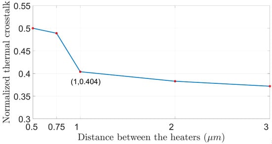 To choose the optimal design, a lower thermal crosstalk must be obtained, such that the contribution of one heater unit would not overheat the other unit and affect the heating of the Si wg area. Overheating can cause unwanted phase-shift deviation, which can easily lead to more optical losses [30,31,32,33,34,35,36,37]. Figure 5 shows the thermal crosstalk versus the distance between the two heaters. The results from Figure 2, Figure 3, Figure 4 and Figure 5 have been analyzed in order to select the optimal design. From Figure 5, it can be observed that a higher normalized thermal crosstalk over 0.45 is obtained in cases of short distance between the heaters which is less than 0.85 µm. Thus, the best design must have less than 0.45 normalized thermal crosstalk. Moreover, the shorter the distance between the heaters, the more efficient the power consumption will be, which means that the consumption will be lower to obtain a π-phase shift, but at the same time, the tradeoff with thermal crosstalk will be greater. Therefore, the optimal design consists of a 1 μm distance between the two heaters. In this case, the power for obtaining a π-phase shift is considerably lower, with 18.95 mW total power and a low normalized thermal crosstalk of 0.404.