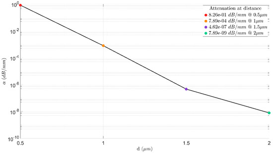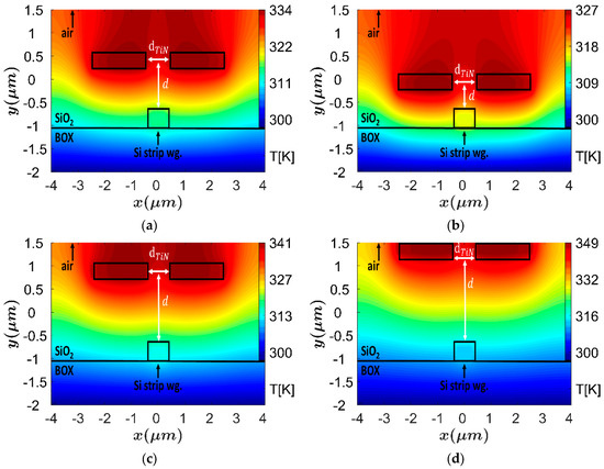 Another important characteristic is the height distance between the double TiN heaters and the Si wg. The TiN heaters have a positive imaginary refractive index that can increase the optical losses in case the heaters are located close to the Si wg. In addition, in this case, less electrical power is needed to obtain a phase shift of π. Thus, an optimization on the d parameter is needed to be achieved in order to understand the tradeoff between optical losses and power consumption. Figure 6a–d shows the thermal profile of the TOPS with a different d value (0.5–2 μm). The resultant data were analyzed by solving the TE mode and extracting the power for the phase shift of π and the absorption coefficient (attenuation). In these figures, it can be noticed that a strong thermal change over the Si wg area is obtained at short distances of d, as shown in Figure 6a,b.