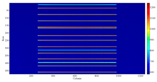 The AAS calibration occurs in a vacuum chamber, which has a better vacuum than 6.4 × 10−3 Pa, with a cleanliness of 1000. The AAS has a thermal control system ensuring that the temperature is consistent with the AAS in orbit. Because the spectral smile does not differ with wavelength, it is necessary to calibrate all pixels of the AAS in the FOV to obtain the wavelength map. However, the wavelength calibration measurements of the Sun port have a relatively lower SNR. Thus, the wavelength calibration is unworkable when offsetting for the deficiency. Therefore, a special collimating system was designed for the spectral line source that improves the luminous flux. The lenses for the collimation system were purchased from Edmund and the information on the light source after the collimation is shown in Table 2. The AAS solar port has a diffuser, which shares one optical system with the Earth port. Each calibration can only cover 2–3 pixels in the spatial dimension and needs to be rotated many times with the rotary table to cover all the spatial dimensions of the CCD pixels. On the other hand, light from the solar port passes through the diffuser and can be calibrated to cover the whole FOV of the AAS at one time, and in this way, the full image-plane spectral maps of the CCD in the calibration are attained. The experimental setup is shown in Figure 3. Multiple spectral lines of the spectral sources are detected by the AAS, as shown in Figure 4. The known spectrum suggests that the wavelength of the other pixels can be obtained by interpolation or the least squares fitting method.