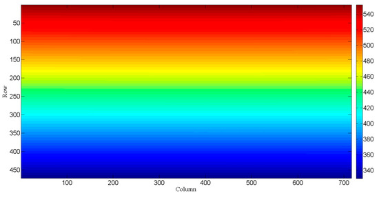 Setting the SFI at an angle, the spectrum can be scanned on the spatial array of the detector using a rotating platform, and the coordinates of all the spectra in the FOV of the AAS can be obtained. By fitting the spectral row number, which is dependent on the spatial column number, a straight line can be obtained. This straight line may tilt on the image surface. To correct the image tilt, the residual value of the fitted straight line is used, and then the residual and the spatial column are employed to fit the curve. By obtaining the highest and lowest points of the curve, the maximum space curvature can be obtained. Figure 10 shows the smile effect of differing spectra. The points denote the measurement data in Figure 10. Also, the solid line designates the fitted curve. The maximum smile represented 1.4 pixels at a wavelength of 550 nm. For the 340 nm smile, it was 0.27 pixels. The minimum denoted 0.2 pixels for 400 nm.