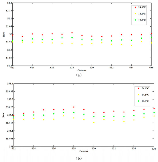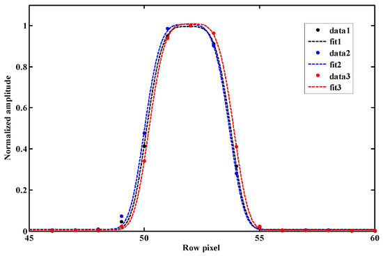 The SRF’s shapes dependent on temperature were measured, as shown in Figure 9. The dots represent the measured data, the dotted line is a fitted curve, and distinct colors represent different temperatures (data1, data2, and data3 correspond to 19.9 °C, 14.1 °C, and 24.6 °C, respectively). The center of the curve varied slightly with temperature, as shown, which is consistent with Figure 6. In addition, when compared to the results at 19.9 °C, the FWHM under other temperatures shows a slight broadening, with 0.06 pixels.