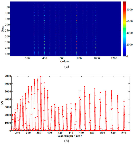 Optical equipment has been designed to accurately measure the SRF. The equipment employs an echelle grating to produce a 50 mm beam, which contains a tunable, uniform separation, and narrow spectral peaks in the range of 340–550 nm. Here, a slit function of 114° was tested by the rotating platform with a step size of 10°, while a spectrum of the Nadir observation was obtained by an extraction in the middle of the map, as shown in Figure 7.